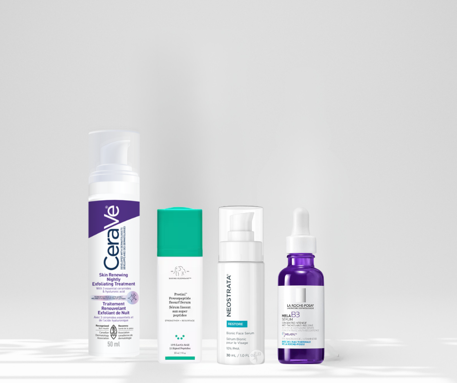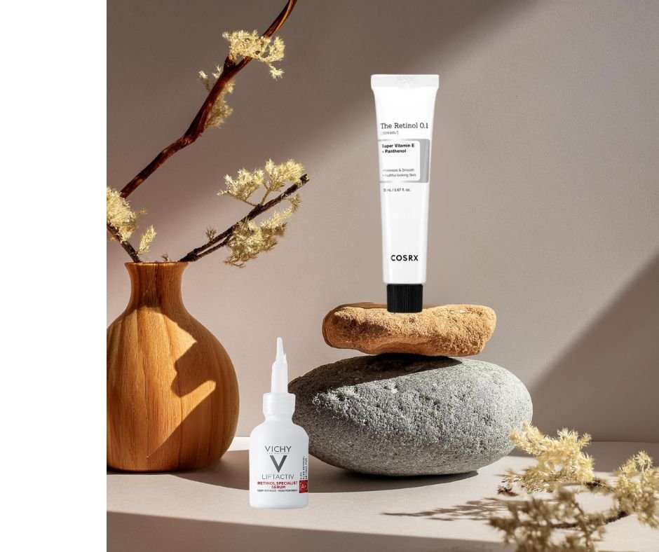 Voici quelques produits, doux et disponibles en vente libre : le rétinol de Vichy (ligne active). Ce produit contient 0,2% de rétinol, une bonne concentration et efficace, n’est pas irritante, contrairement aux formules à 1%. Il contient des peptides (réduisant les rides) et des probiotiques. Il est sans parfum, sous forme de sérum lacté léger, non collant et idéal pour tous types de peau.